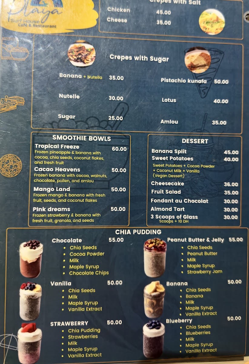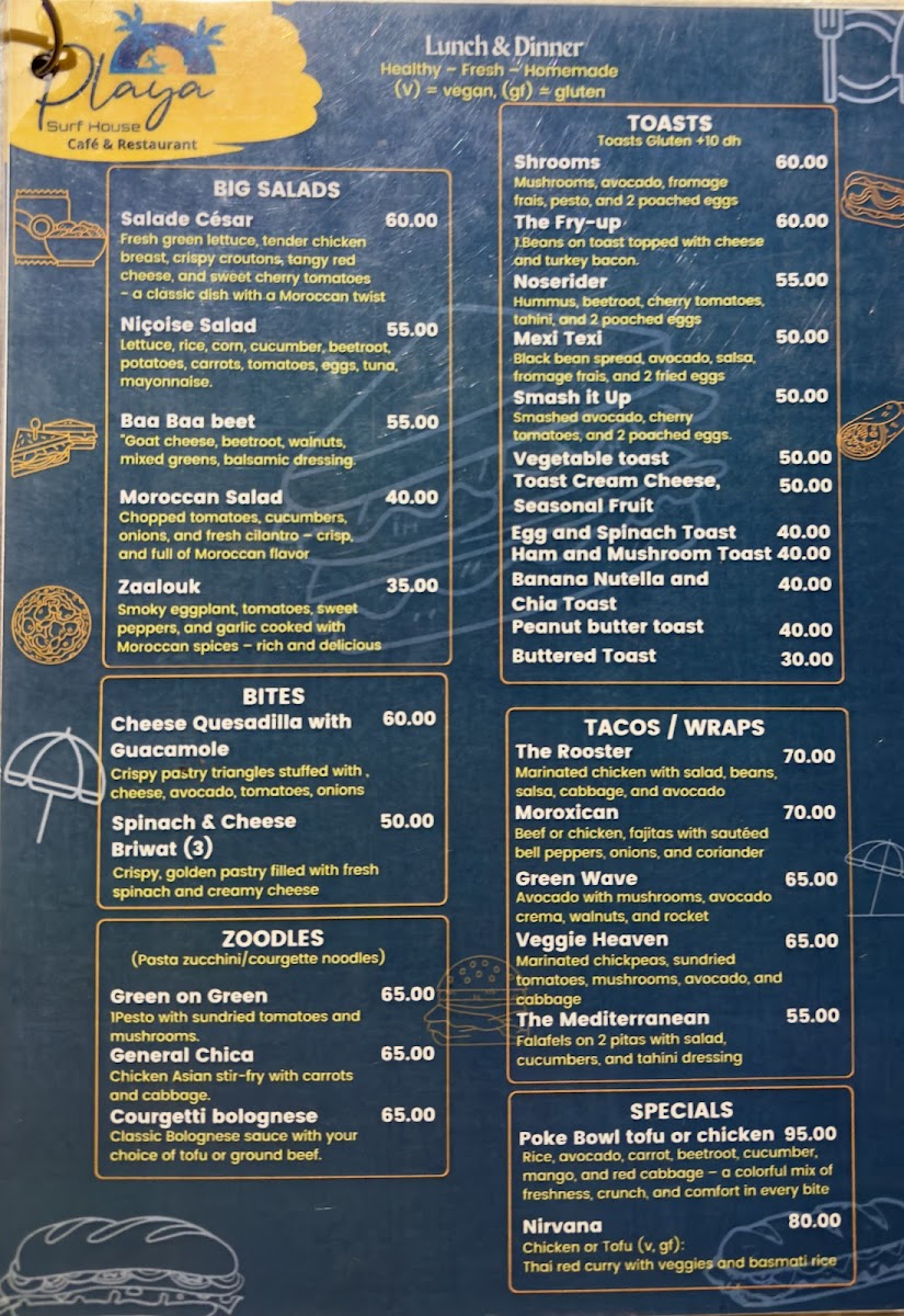 Welcome to Playa Surf House Restaurant | Cafe, a hidden gem in Tamraght, Morocco, where the essence of coastal relaxation meets culinary delight. This charming cafe boasts a warm ambiance, inviting you to unwind as you savor the rich aromas of freshly brewed coffee.